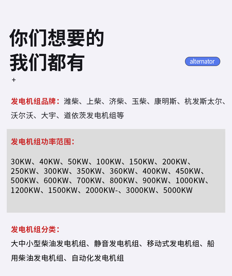 重慶立創(chuàng)動力設(shè)備有限公司所租賃的柴油發(fā)電機(jī)組均采用進(jìn)口柴油發(fā)電機(jī)組。他們的特點是體積更小、抗負(fù)載能力更強(qiáng)、油耗更低、穩(wěn)定性更好等。具體規(guī)格100KW--2000KW,為大宇 、康明斯、沃爾沃、三菱、卡特等,隨時為客戶提供不同功率機(jī)組自備發(fā)電業(yè)務(wù)。租賃功率范圍:30kw、37kw、45kw、60kw、90kw、100kw、150kw、200kw、250kw、300kw、400kw、500kw、600kw、800kw、1000kw、1200kw,1800Kw、2000KW。